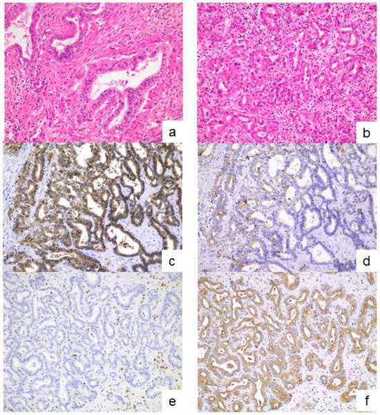 In cases where the subclassification could not be determined based on the H&E-stained findings (n = 31), immunohistochemical analysis was further performed. Primary antibodies against S100P (1:100 dilution, ab133554, Abcam) and SPP1 (1:200 dilution, ab214050, Abcam) were used as the marker characteristics of the large- and small-duct-type iCCAs, respectively [20,21,22]. After deparaffinization, antigen retrieval was performed by microwaving the tissue sections in 10 mmol/L citrate buffer (pH 6.0). Endogenous peroxidase activity was blocked by immersing the sections in 0.3% hydrogen peroxide. Following pretreatment with blocking serum (Dako-Cytomation, Glostrup, Denmark), the sections were incubated overnight at 4 °C with primary antibodies. Subsequently, they were incubated with a secondary antibody conjugated to a peroxidase-labeled polymer using the HISTOFINE system (Nichirei, Tokyo, Japan). Color development was achieved using 3,3′-diaminobenzidine tetrahydrochloride, and the sections were counterstained lightly with hematoxylin. Based on the results of the H&E and immunohistochemical staining, the iCCA cases were classified into small- and large-duct types (Figure 1c–f).