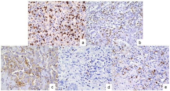 Immunohistochemical assessment of immune-related molecules in the cells of the tumor immune microenvironment. (a) CD8, (b) PD-1, (c) PD-L1, (d) CTLA-4, and (e) S100 protein. Original magnifications: × 400.