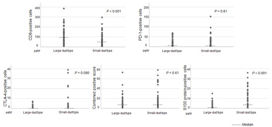 Figure 3 shows the differences in the expression of immune-related molecules in the tumor or tumor-infiltrating cells between each subclassification. The results show no significant differences in the expressions of PD-1 and CTLA-4 and the CPS between the two subclassifications. CD8 was more frequently expressed in large-duct-type iCCAs than in small-duct-type iCCAs (p < 0.001). Small-duct-type iCCA had a significantly higher expression of the S100 protein, a marker of DCs, than large-duct-type iCCA (p < 0.001). Supplementary Table S1 depicts the median values with ranges for each type.
