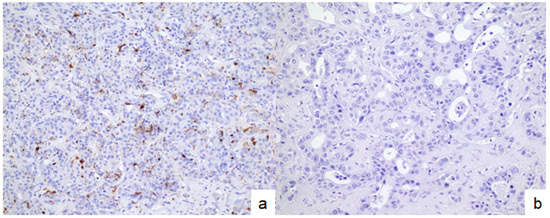 Small-duct-type iCCAs with high and low infiltration of dendritic cells. (a) Small-duct-type iCCAs with high infiltration of dendritic cells. (b) Small-duct-type iCCAs with low infiltration of dendritic cells. Dendritic cell infiltration was assessed via immunostaining using S100 protein. iCCA, intrahepatic cholangiocarcinoma. Original magnification: × 200.