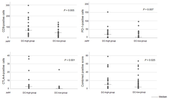 To further investigate the impact of DC infiltration, small-duct-type iCCAs were stratified into DC-high and DC-low groups (Figure 4). Differences in immune-related molecules, including CD8, PD-1, CTLA-4, and PD-L1, between the two groups were evaluated. The DC-high group had significantly higher expression of CD8, PD-1, and CTLA-4 than the DC-low group. Further, the DC-high group had a higher CPS than the DC-low group (Figure 5). Supplementary Table S2 shows the median values with ranges for each group.
