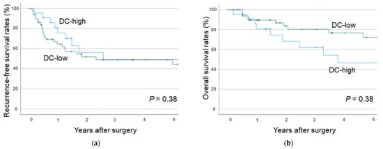 Based on the Kaplan–Meier survival analysis, the recurrence-free survival and overall survival differed between the DC-high and DC-low groups in patients with small-duct-type iCCAs. However, the results did not significantly differ (Figure 6).
