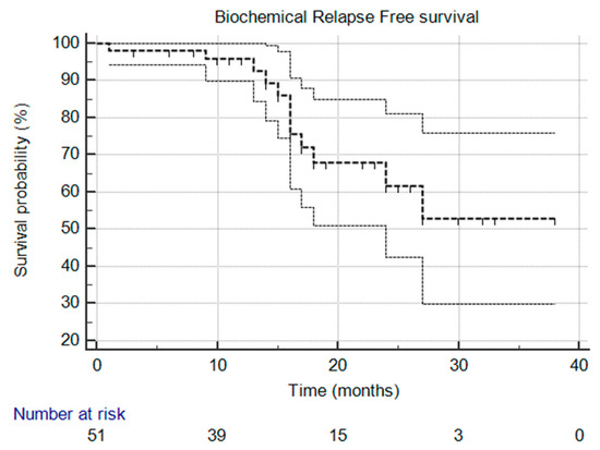 Kaplan–Meier survival curve that illustrates biochemical relapse-free survival over time. The median was not reached, and the 95% confidence interval is entirely above the 50% threshold, meaning the median is indeed not reached.