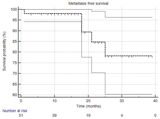 Kaplan–Meier survival curve that illustrates metastasis-free survival. The median was not reached, and the 95% confidence interval is entirely above the 50% threshold, meaning the median is indeed not reached.
