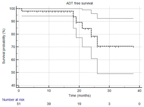 Kaplan–Meier survival curve illustrating ADT-free survival over time. The median was not reached, and the 95% confidence interval is entirely above the 50% threshold, meaning the median is indeed not reached.