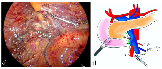 - Nagakawa, Y.; Hosokawa, Y.; Sahara, Y.; Takishita, C.; Hijikata, Y.; Osakabe, H.; Nakajima, T.; Shirota, T.; Katsumata, K.; Nakamura, M.; et al. Approaching the superior mesenteric artery from the right side using the proximal-dorsal jejunal vein preisolation method during laparoscopic pancreaticoduodenectomy. Surg. Endosc. 2018, 32, 4044–4051. [Google Scholar] [CrossRef]
