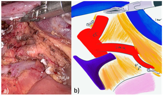 Dissection of the mesopancreas using robotic posterior artery-first approach. (a) intraoperative vision of the surgical field with the posterior aspect of the superior mesenteric vein and right lateral aspect of the superior mesenteric artery. (b) Schematic illustration showing superior mesenteric vein (smv), superior mesenteric artery (sma), celiac trunk (ct), first jejunal artery (1st ja).