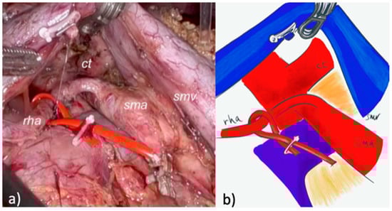 Completion of mesopancreas excision using robotic posterior artery-first approach, in patient with aberrant hepatic artery from superior mesenteric artery. (a) intraoperative vision of the surgical field with superior mesenteric vein/portal vein (blu vessel loops) and the aberrant hepatic artery (red vessel loop). (b) Schematic illustration showing superior mesenteric vein (smv), superior mesenteric artery (sma), replaced right hepatic artery (rha).