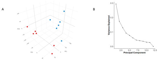 Principal Component Analysis (PCA) based on gene expression profiles revealed that PC1 and PC2 together explained 45.7% of the total variance, which is close to the typical threshold of acceptability around 40–50% of the variance explained by the first two component. Including PC3 and PC4 increased the explained variance to 68.8% (Figure 1A). Since PCA mainly shows how samples are distributed, a scree plot was drawn to complement the PCA interpretation. As depicted in Figure 1B, there was a steep slope at the beginning, indicating that the first principal components (PC1 and PC2) explain most of the variability. However, the subsequent components provide increasingly less relevant information only after the inflection point, approximately located between PC3 and PC5.