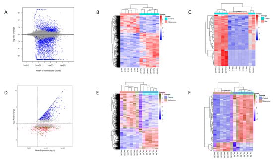 Differential expression analysis results using two RNA-seq workflows. (A) MA plot showing the relationship between the mean of normalized counts and the log2 fold change, obtained using the Bowtie2–DESeq2 pipeline. (B) Heatmap of gene expression across melanoma and control samples. (C) Heatmap of the top 50 differentially expressed genes (DEGs). (D–F) Corresponding plots generated using the HISAT2–StringTie–Ballgown workflow, providing a comparative visualization of expression differences across workflows.