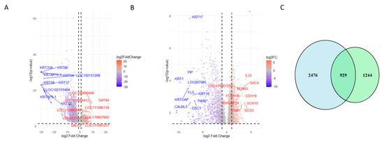 Comparison of differentially expressed genes identified by both workflows. (A) Volcano plot showing the distribution of DEGs identified using the Bowtie2–DESeq2 pipeline. The top 10 upregulated and downregulated genes are labeled. (B) Volcano plot for DEGs identified using the HISAT2–StringTie–Ballgown pipeline, highlighting the top 10 upregulated and downregulated genes. (C) Venn diagram depicting the overlap of DEGs detected by both workflows, indicating the shared and unique transcriptomic changes captured by each approach.