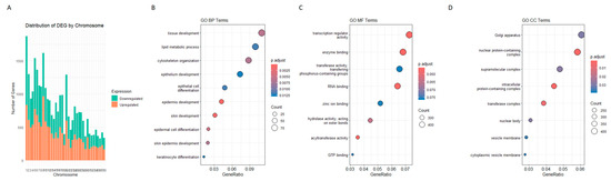 Functional and chromosomal distribution of DESeq2-derived DEGs. (A) Chromosomal distribution of DEGs identified through the DESeq2 pipeline. DEGs are mapped along human chromosomes revealing positional enrichment. (B–D) Gene Ontology (GO) enrichment analysis classifying DEGs into three functional categories as follows: Biological Process (BP), Cellular Component (CC), and Molecular Function (MF). Bar plots show the top enriched terms in each category.