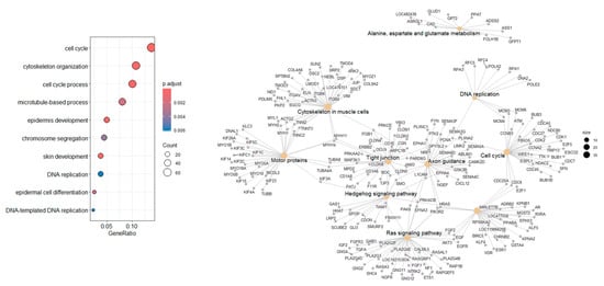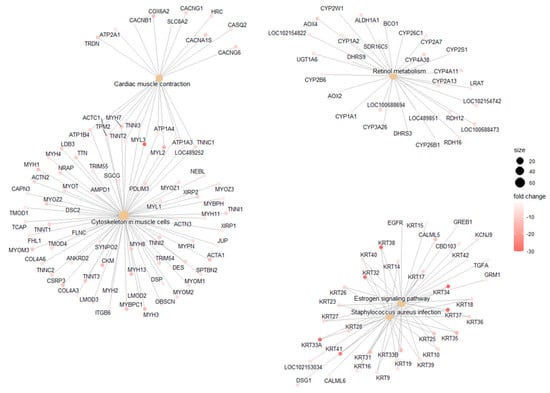 Our analysis revealed an asymmetrical distribution of DEGs across chromosomes. This pattern may reflect the genomic organization of coding genes in the canine genome, where larger chromosomes generally contain more genes. Furthermore, the significant number of DEGs observed on chromosome 9 suggests its potential involvement in the biological response to COM. Similar chromosomal patterns have been reported in previous studies [13,20].