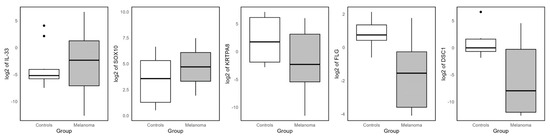 To validate the RNA-seq results, RT-qPCR was performed on a subset of DEGs in an independent set of melanoma and control samples. Five genes were selected for validation as follows: two upregulated (IL-33 and SOX10) and three downregulated genes (KRTPA8, FLG and DSC1) identified by both RNA-seq workflows (Figure 7). The expression patterns obtained by RT-qPCR were consistent with the RNA-seq data, confirming the differential expression in melanoma samples relative to controls. Notably, GATA4, although identified as the most upregulated gene in the Bowtie2–DESeq2 analysis, was excluded from the validation due to inefficient amplification.