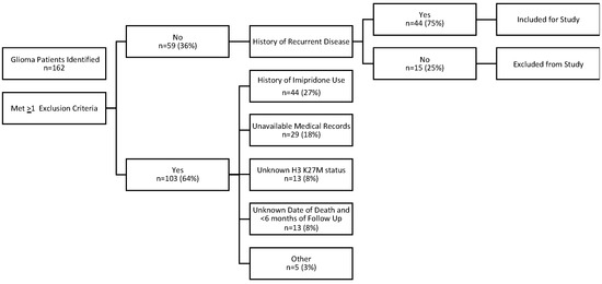 This study was intended to evaluate prognostic factors for survival in patients with biopsy-proven recurrent H3 K27M-mutant and/or midline glioma. A total of 162 potential patients were identified across participating institutions, with 44 patients with recurrent disease meeting the criteria for this analysis (Figure 1). Primary reasons for exclusion from analysis included treatment with ONC201 or ONC206 at any time (27.2%), insufficient medical records available (17.9%), unknown H3 K27M status (8%), and either an unknown date of death or <6 months survival follow-up from initial diagnosis (8%). One of the forty-four patients had no follow-up after first recurrence and therefore was censored as of first recurrence.