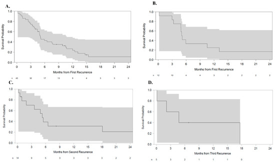 Overall survival (A) from first recurrence in all patients, (B) from first recurrence in patients excluding DIPG, leptomeningeal spread, CSF dissemination, or primary spinal tumors, (C) from second recurrence, and (D) from third recurrence. In general, OS was identical (5.1 months) from first recurrence in all patients, and in the cohort of patients excluding DIPG, leptomeningeal spread, CSF dissemination, and spinal tumors (A and B, respectively). Survival at second recurrence (5.3 months) was slightly longer than that at third recurrence (4.7 months, C and D, respectively). Shaded areas represent the 95% CI.