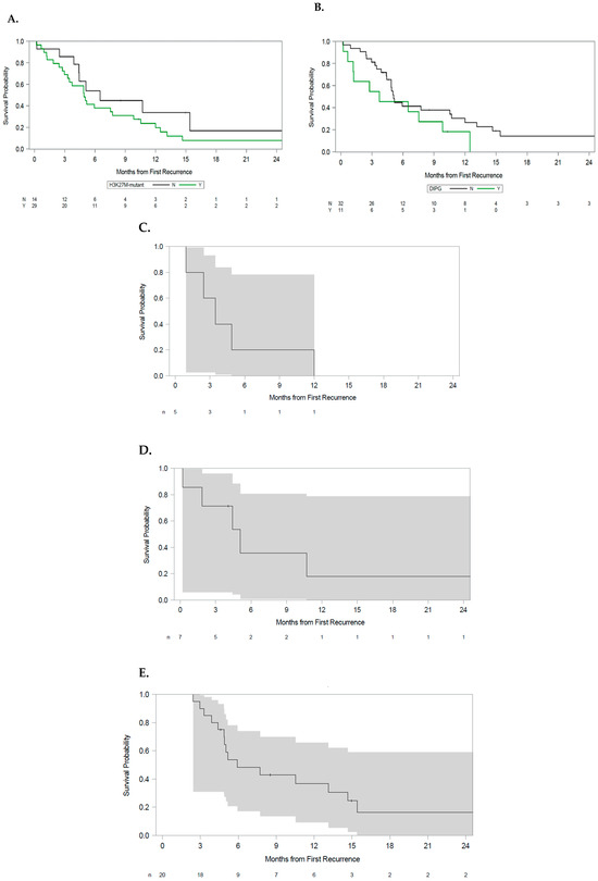 High-grade glial tumors represent the most morbid form of brain cancer [1]. Approximately 80% of midline gliomas and 5% of cerebral hemispheric gliomas harbor a K27M mutation in the genes encoding isoforms of the Histone proteins H3.1 or H3.3 [2,3,4,5,6,7,8,9]. This somatic missense mutation is known as H3 K27M, and is associated with loss of H3 K27 trimethylation, poorer response to standard therapy, and lower overall survival, especially in younger patients [10]. To date, radiotherapy is the standard therapeutic intervention for diffuse midline gliomas, but only provides a median six-month event-free survival, with little effect on overall survival [5,10]. As such, the presence of an H3 K27M mutation in a midline tumor now confers a WHO Grade 4 status [11,12,13,14,15]. Indeed, if untreated, patients suffering from H3 K27M-mutant diffuse intrinsic pontine glioma (DIPG) have a median survival of only 1–4.5 months from diagnosis [6,16,17,18]. Further research has since revealed additional molecular characteristics of H3 K27M-mutant tumors, including distinct protein, RNA, DNA methylation, and epigenetic profiles [15]. This recent work has shed some light on a few novel prognostic factors in H3 K27M DMG, such as FGFR1 mutations that are associated with a more favorable clinical prognosis. However, there remains limited published information about prognostic factors and disease progression overtly related to the H3 K27M mutation in glioma [19], particularly in the recurrent setting. Therefore, we conducted a clinical history study that aimed to define outcomes and prognostic factors in patients with recurrent H3 K27M-mutant and/or midline glioma.