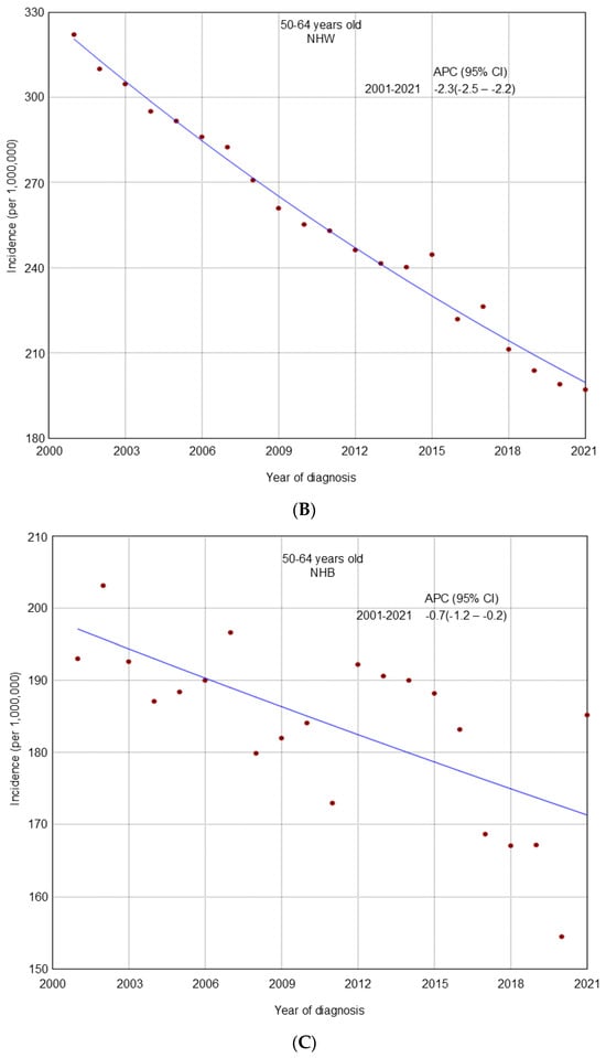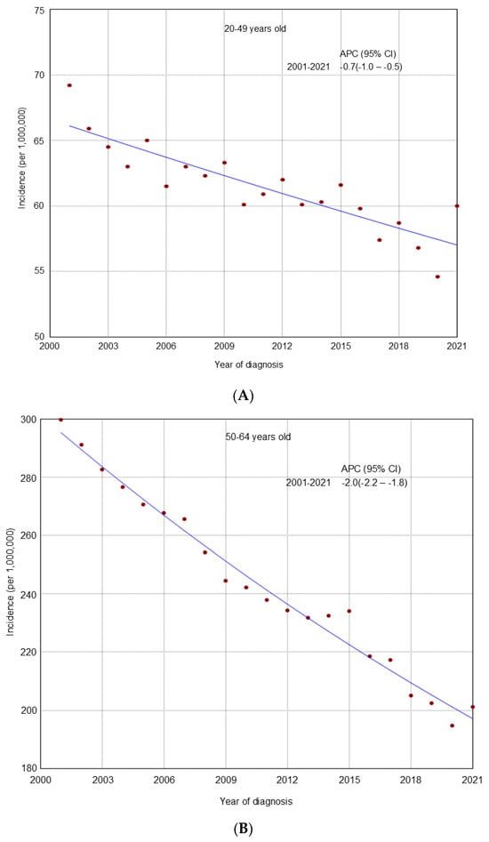 Age-specific trends in ovarian cancer incidence among U.S. women aged 20 years and older, 2001–2021. (A). 20–49 years age group; (B): 50–64 years age group; (C): 65 years and older age group.