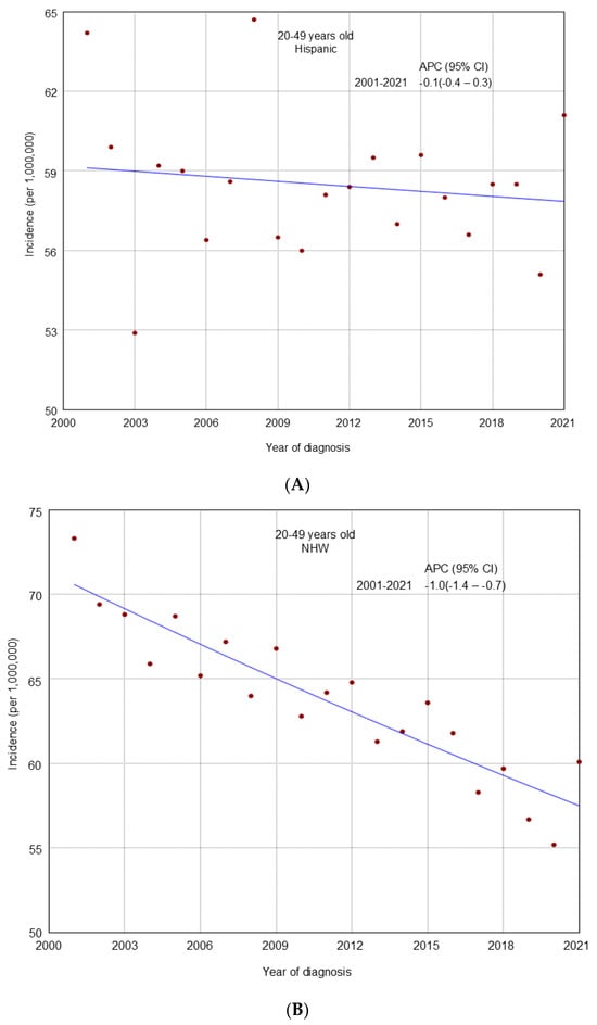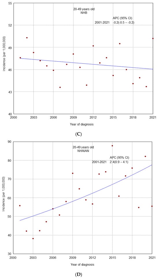 From 2001 to 2021, an overall declining trend in incidence was observed across all age groups (Figure 1). A similar decline was noted in most racial and ethnic groups by age (Figure 2, Figure 3 and Figure 4), cancer stage by age (Supplemental Figures S1–S3), and histologic subtype by age (Supplemental Figures S4–S6). Ovarian cancer incidence was relatively stable among NHAPI women in the 20–49 years old group (APC 0.0; 95% CI −0.4 to 0.4). However, increasing trends were observed among NHAIAN women aged 20–49 years (APC 2.4, 95% CI 0.9 to 4.1) and among those aged 50–64 years old (APC 0.4; 95% CI −0.1 to 1.1). Joinpoint analyses identified one joinpoint in localized ovarian cancer incidence trends among all three age groups. Among women aged 20–49 and 65 years and older, rates declined from 2001 to 2011, while among those aged 50–64, the decline extended to 2012. This was followed by an upward trend through 2021. Between 2011 and 2021, premenopausal women (20–49 years) consistently showed a higher incidence of localized ovarian cancer compared to postmenopausal groups. Additionally, one joinpoint was identified in the incidence trends of clear cell and endometrioid ovarian cancer subtypes among women aged 20–49 years, showing an initial decline followed by an increase.