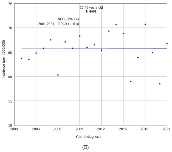 Trends in ovarian cancer incidence from 2001 to 2021 among U.S. women aged 20-49 years stratified by race and ethnicity. (A): Hispanic; (B): Non-Hispanic White (NHW); (C): Non-Hispanic Black (NHB); (D): Non-Hispanic American Indian/Alaska Native (NHAIAN); (E): Non-Hispanic Asian or Pacific Islander (NHAPI).