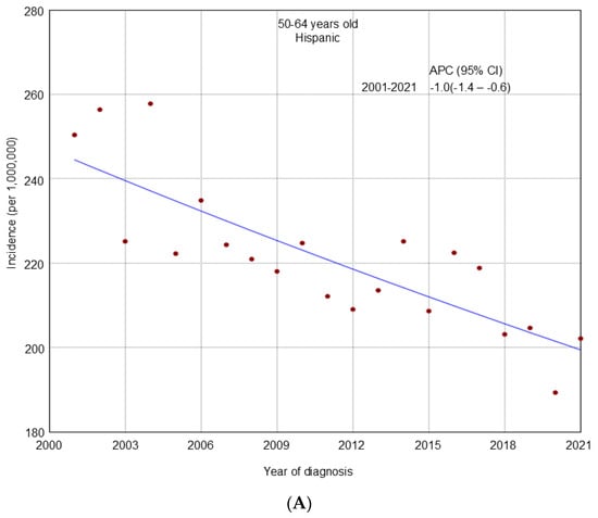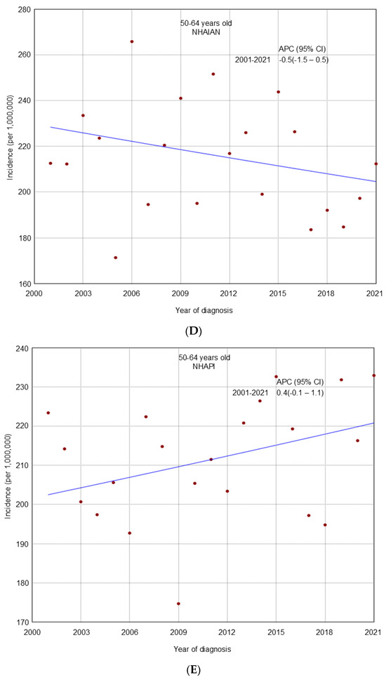 Trends in ovarian cancer incidence from 2001 to 2021 among U.S. women aged 50-64 years stratified by race and ethnicity. (A): Hispanic; (B): Non-Hispanic White (NHW); (C): Non-Hispanic Black (NHB); (D): Non-Hispanic American Indian/Alaska Native (NHAIAN); (E): Non-Hispanic Asian or Pacific Islander (NHAPI).