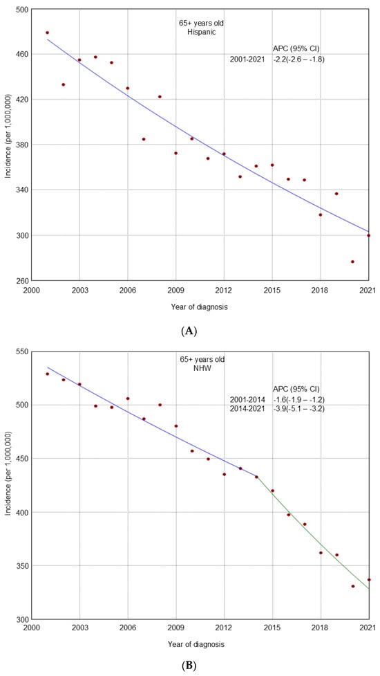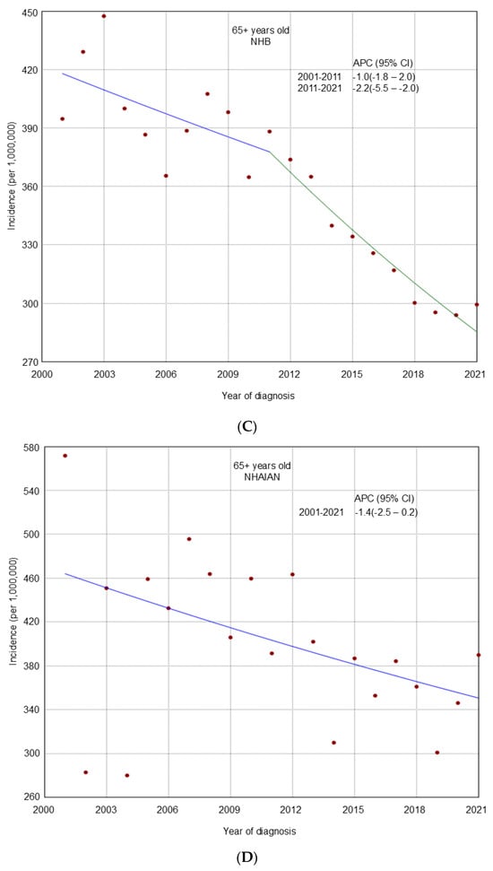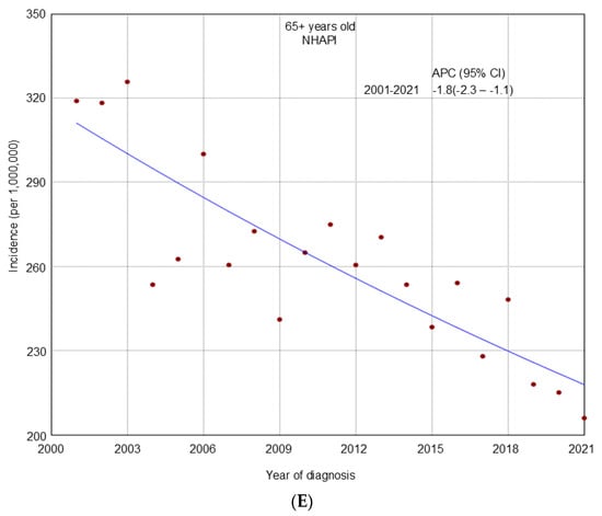 Trends in ovarian cancer incidence from 2001 to 2021 among U.S. women aged 65 years and older stratified by race and ethnicity. (A): Hispanic; (B): Non-Hispanic White (NHW); (C): Non-Hispanic Black (NHB); (D): Non-Hispanic American Indian/Alaska Native (NHAIAN); (E): Non-Hispanic Asian or Pacific Islander (NHAPI).