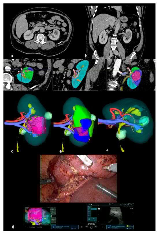 Pre- and intraoperative visualization during a 3D image-guided robot-assisted partial nephrectomy (3D-IGRAPN). (a) Axial CT scan; (b) coronal CT scan; (c) CT scan segmentation showing the renal parenchyma in light blue, the tumor in pink, and simulated ischemic territories according to clamping points in green and dark blue; (d) 3D model of the tumor-bearing kidney; (e) simulation of ischemic territories on the 3D model; (f) simulation of the tumor resection bed; (g) intraoperative console view with Tile Pro display during 3D-IGRAPN.