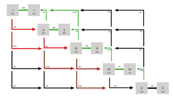 Evolution of CKD stages at 3 months. I: eGFR > 90 mL/min; II: eGFR between 60 and 90 mL/min; III: eGFR between 30 and 60 mL/min; IV: eGFR between 15 and 30 mL/min; V: eGFR < 15 mL/min.