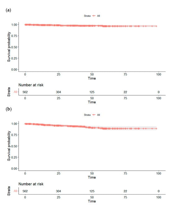 Survival analyses were executed using the Kaplan–Meier method to estimate survival probabilities and evaluate time-to-event outcomes. Survival curves were generated to visually represent these estimates, clearly indicating censored data to account for participants lost to follow-up or who had not experienced the event by the conclusion of the study.