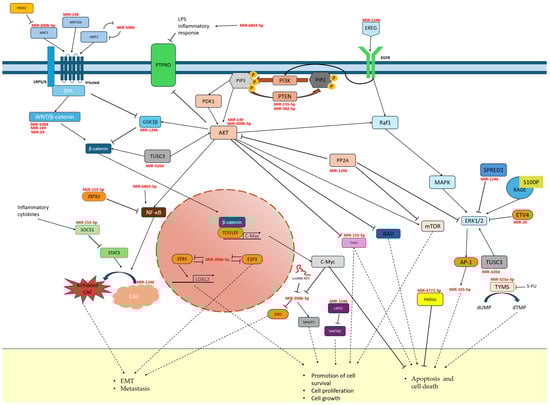 MiR-194 belongs to cluster genes, which means that its promoter also affects the expression of another miRNA gene located nearby. In addition, the sequence from which mature transcripts are created occurs in humans in two copies—miR-194-1 on chromosome 1 in a cluster with miR-215 and miR-19-2 on chromosome 11 in a cluster with miR-192 [119]. Literature data report that both strands 3p and 5p have similar tumour-suppressive properties but are characterized by different regulatory pathways. The effects of overregulation of this miRNA include attenuation of tumour cell growth, migration, EMT, drug resistance, and proliferation. MiR-194-2-5p is a suppressor microRNA with reduced expression in colorectal cancer [68,120]. The strand is functionally related to the MAP4K4/c-JUN/MDM2 pathway, where it targets MAP4K4 and inhibits its expression. This results in inhibition of tumour cell proliferation, which is why it is a potentially important therapeutic target [120]. Studies also report its involvement in the induction and regulation of inflammation, depressive changes, and the development of addictions [121]. Its repressor is the regulatory protein HMGA2 (a non-histone chromosomal protein called high mobility group AT hook 2) [122]. One of the effector proteins is VAPA, which is responsible for regulating intracellular transport and maintaining the ER structure; regulation of this protein by miR-194 disrupts tumour growth [122,123].