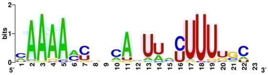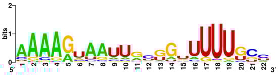 MiR-548—This is a family of microRNA precursor genes specific to primates, with an exceptionally common occurrence in the genome. According to miRbase, 73 miR-548 precursor genes located on almost all human chromosomes have been distinguished, which is why researchers have put forward a hypothesis about the transposon origin of this microRNA. Compared to other microRNAs, this family is characterized by relatively low sequence conservation, which, according to researchers, may lead to the separation of new microRNA families with different purposes and functions in the future [159]. This high heterogeneity of miR-548 strands is presented on Figure 2 and Figure 3 with the size of the letters expressing the frequency of the nucleotides in given location through the whole group of the miR-548 strands.