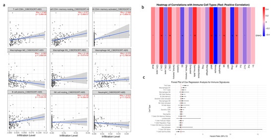 Given that PAAD is widely recognized as an immune desert, the role of ENHO in immune infiltration was examined. First, a correlation analysis was conducted between ENHO expression and the CIBERSORT absolute estimation of infiltration for nine different immune cell types. Increased ENHO expression was significantly correlated with higher infiltration of CD8+ T cells (rho = 0.345, p < 0.001), memory resting CD4+ T cells (rho = 0.377, p < 0.001), M2 macrophages (rho = 0.275, p < 0.001), and plasma B cells (rho = 0.23, p = 0.0024). Conversely, a significant negative correlation was observed between ENHO expression and the infiltration of M0 macrophages (rho = −0.283, p < 0.001) and resting NK cells (rho = −0.155, p = 0.043). Correlations with M1 macrophages, neutrophils, and activated CD4 memory cells did not reach statistical significance (Figure 4a).