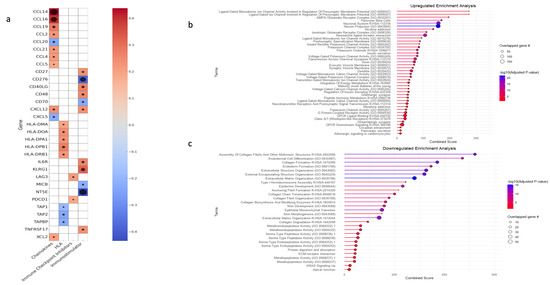 An elucidation of ENHO’s immune role, alongside a gene set enrichment analysis for the differentially expressed upregulated and downregulated genes. (a) shows a heatmap of the correlations between ENHO expression and different chemokines, human leukocyte antigens (HLAs), immune checkpoint inhibitors, and immunostimulators. (b) GSEA of differentially expressed upregulated genes. (c) GSEA of differentially expressed downregulated genes. The black circles in (a) correlate with -log10(FDR), all FDR’s are < 0.05.