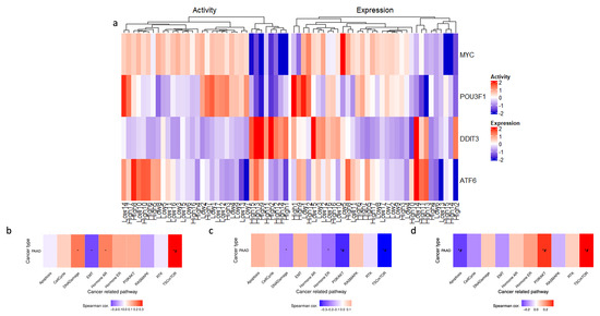 Exploring ENHO’s transcriptional landscape through transcription factor activity alongside Gene Set Variation Analysis of upregulated, downregulated, and co-expressed genes. (a) shows a heatmap that elucidates differential transcription factor expression and activity between the top and bottom 10% of ENHO expressors. (b–d) show the GSVA in 10 cancer-related pathways for differentially expressed (b) upregulated genes, (c) downregulated genes, and (d) co-expressed genes. * = p < 0.05, # = FDR < 0.05.