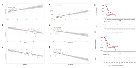 Validation of the role of different miRNAs in PAAD. The figure shows the correlation of MiR-375.3p with (a) ENHO, (b) KCNN4, and (c) COL12A1. Furthermore, the figure shows the correlation between MiR-1179 and (d) ENHO, (e) FN1, and (f) MET. (g) Kaplan–Meier of OS for MiR-375.3.p. (h) Kaplan–Meier of OS for MiR-1179.