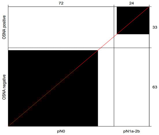Bangdiwala’s Observer Agreement Chart illustrating the diagnostic performance of OSNA versus H&E in the assessment of nodal metastases. The black boxes indicate the concordant cases. Of the 24 positive cases assessed by H&E, 22 cases were also positive with OSNA. A total of 61 out of 72 cases determined to be negative by H&E were also negative with OSNA. Abbreviation: OSNA, one-step nucleic amplification assay.