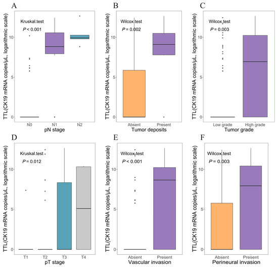Ninety patients were included in the analysis, with seven excluded for missing values in key variables of interest. Figure 2B–F shows the significant associations of several high-risk features, e.g., the presence of tumor deposits [TDs], perineural invasion [PNI], vascular invasion [VI], G3/4 histology, and pT3/4, with elevated TTL (p < 0.05). Notably, TTL significantly increased following pN stages, progressively from pN0 (mean 476.3 copies/μL) to pN1 (mean 53,877.6 copies/μL) and peaking at pN2 (mean 78,420.0 copies/μL) (Figure 2A).