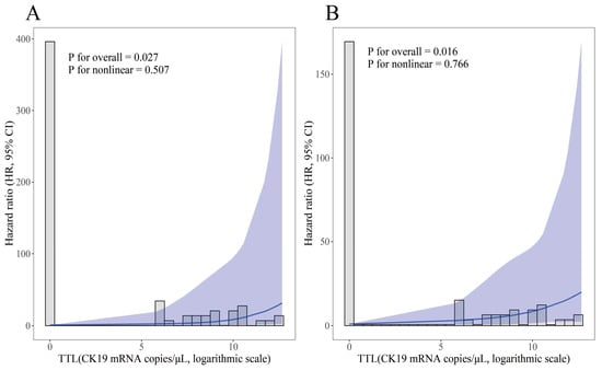 Unadjusted restricted cubic spline regression analyses of relationships between log-transformed TTL value and HRs for cancer-specific survival (A) and recurrence-free survival (B) in rectal cancer patients. The solid lines represent the estimated hazard ratios, with shaded areas denoting the 95% confidence intervals. Abbreviation: TTL, total tumor load (cytokeratin 19 mRNA copies/μL); HR, hazard ratio.