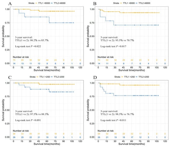 KM curves illustrated a significantly reduced 3-year CSS and RFS associated with TTL ≥ 6000 copies/μL, in contrast to a TTL of <250 or 6000 copies/μL (Figure 4 and Figure 5).