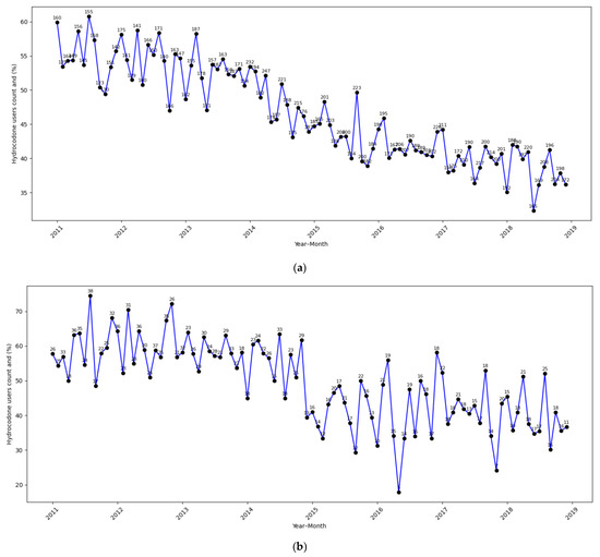 We performed univariate analyses to describe the sample characteristics, presenting the frequencies and percentages for all variables included in the study. We used chi-square tests to examine subgroup differences according to hydrocodone and non-hydrocodone opioid use. To assess the differential effects of policy changes and the overall temporal trends across dual eligibility and racial/ethnic subgroups, we conducted multivariable logistic regression analyses that controlled for patient characteristics, including age, race–ethnicity, Medicaid dual eligibility, depression, Charlson comorbidity score, and cancer treatments. The effect of the policy change was evaluated based on a binary indicator that distinguished the periods before and after the rescheduling of hydrocodone in October 2014, while the temporal trend was assessed using a continuous variable, representing time in months. We conducted large-sample Wald chi-square tests for model specification [37]. Based on these model specification tests, the sample was stratified into three groups to examine the differential impacts on hydrocodone use—non-dual-eligible, dual-eligible non-Hispanic White, and dual-eligible racial–ethnic minority. For non-hydrocodone opioid use, the sample was categorized into three groups—dual-eligible, non-dual-eligible non-Hispanic White, and non-dual-eligible racial–ethnic minority. Details of the model specification test results will be discussed in the results section. To illustrate the temporal trends, we plotted monthly time trends from 2011 to 2019 in the percentage of patients using hydrocodone and non-hydrocodone prescription opioids by the subgroups.