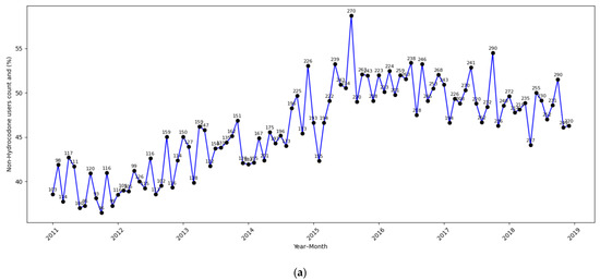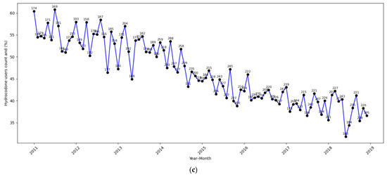 Supplementary Table S4 provides the results from the supplementary analysis on long-term opioid use. In contrast to our main findings for hydrocodone use, this supplementary analysis showed that the policy change was not significantly associated with long-term hydrocodone use in any subgroup. Among dual-eligible non-Hispanic White patients (AOR = 0.81; 95% CI: 0.58–1.14; p = 0.228) and dual-eligible racial–ethnic minority patients (AOR = 0.88; 95% CI: 0.54–1.44; p = 0.609), post-policy reductions were statistically non-significant. Among non-dual eligible patients, long-term hydrocodone use was stable (AOR = 1.03; 95% CI: 0.83–1.29; p = 0.783), though a statistically significant downward trend over time was observed (AOR = 0.89 per 12 months; p < 0.001), suggesting a broader secular decline. Similarly, no statistically significant changes were observed in long-term non-hydrocodone opioid use post-policy change across any subgroup. The strongest signal—a borderline decline—was seen among non-dual-eligible non-Hispanic White patients (AOR = 0.65; 95% CI: 0.42–1.01; p = 0.056). Across all groups, time-related trend effects were non-significant. These results suggest that while short-term prescribing behavior was responsive to the policy change, long-term opioid use—potentially representing patients with sustained pain needs—was less affected. This may indicate that providers maintained continuity in pain management for patients requiring prolonged opioid therapy, reflecting appropriate clinical judgment. Figure 1a–c illustrate the monthly time trends in the percentage of patients using hydrocodone, providing a visual representation consistent with the logistic regression results. A consistent post-policy decline was observed across all subgroups, with the steepest reduction being seen among dual-eligible racial–ethnic minority patients (Figure 1b), aligning with the strongest policy impact detected in the regression analysis. Dual-eligible non-Hispanic White patients (Figure 1a) and non-dual-eligible patients (Figure 1c) also exhibited decreasing trends, though the drop in hydrocodone use was less pronounced than the dual-eligible racial–ethnic minority subgroup.