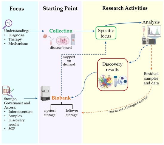 - “Research Biobank”—A legal entity, or part of a legal entity, formally established at a public or private institution; a non-profit. The research biobank as a service structure, at the service of the scientific communities, is the guarantor of the principles, rights, and processes that constitute biobanking for future research purposes. In full compliance with the informed consent/assent to research biobanking expressed and the rights of the participants involved, the biobank guarantees and manages, according to proven quality standards, the stable and continuous collection, conservation, use, and access of human biological materials, and/or related and derived data, for research. The sharing of biobanked samples/data, as well as results, is the cornerstone of all the activity of a research biobank (Figure 5) [164,165,166,167].