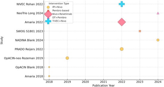 Timeline of neoadjuvant immunotherapy trials in melanoma (shape-coded intervention, bubble size based on N patients) [12,15,16,17,18,19,20,21,22].