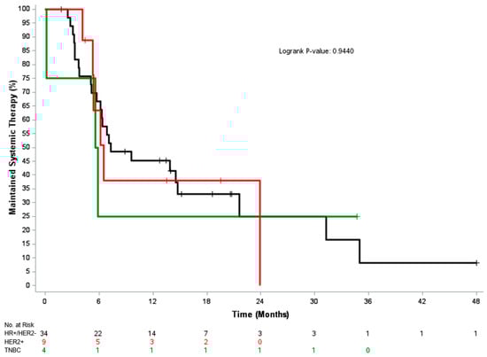 Kaplan–Meier curve for time to next systemic treatment according to breast cancer subtype. Abbreviations: HR, hormone receptor; HER2, human epidermal growth factor receptor 2; TNBC, triple-negative breast cancer.