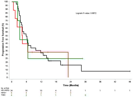 Kaplan–Meier curve for progression-free survival according to breast cancer subtype. Abbreviations: HR, hormone receptor; HER2, human epidermal growth factor receptor 2; TNBC, triple-negative breast cancer.