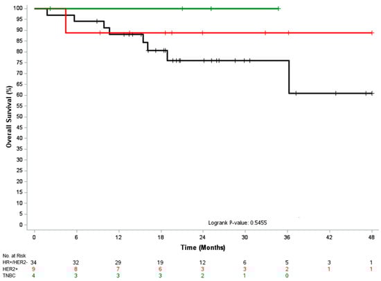 Kaplan–Meier curve for overall survival according to breast cancer subtype. Abbreviations: HR, hormone receptor; HER2, human epidermal growth factor receptor 2; TNBC, triple-negative breast cancer.