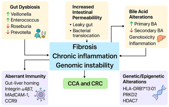 In patients with PSC-IBD, compared with those with UC, significant downregulation of genes and pathways involved in cancer regulation is observed [31]. In particular, DNA damage-repair mechanisms, cellular checkpoints, p53 signaling, and mitotic transition processes, such as APC/CCdc20-mediated cyclin A degradation, are impaired [31]. Some genes, such as TUBB2A, appear to play a central role in these molecular alterations [31]. Methylation of a component of the TUBB6 gene has been shown to be significantly positively correlated with colonic dysplasia [56]. In parallel, there is a marked reduction in the expression of PRAC1, a gene normally associated with decreased susceptibility to right colon cancers [57]. Taken together, these changes suggest an impairment of cellular surveillance and protection mechanisms against neoplastic transformation [31]. Further observations indicate that certain beta-tubulins, such as TUBB5, may be involved in the altered immune response characteristic of hepatic autoimmune disorders, suggesting a potential link between immunity, alterations in the gut microbiota, and cancer risk [58]. Profound changes are also present at the biliary level, with increased abundance of microorganisms such as Lactobacillus, Actinomyces, Alloscardovia, and Peptostreptococcaceae [59]. Some of these microbial changes are associated with changes in bile acid composition, such as increased tauroursodesoxycholic acid (TUDCA), which may contribute to the promotion of an environment conducive to tumorigenesis [29]. Chronic epithelial damage, induced by multifocal biliary stenosis, the accumulation of toxic bile acids, and microbial translocation, results in the activation of cholangiocytes, leading to cell proliferation and the production of cytokines and growth factors [19]. However, it remains unclear if activated cholangiocytes directly activate B-cell antibody production and T-cell expansion [60]. This process promotes the development of a pro-oncogenic microenvironment, characterized by epithelial regeneration, fibrosis, angiogenesis, and immunoevasion [19]. In addition, activation of the peribiliary glands can lead to the formation of dysplastic lesions, which are considered precursors to CCA [61]. A higher frequency of metaplasia and dysplasia of cholangiocytes has been observed in patients with PSC-CCA, compared with those with PSC without neoplasia, regardless of the duration of the disease [60,62,63].