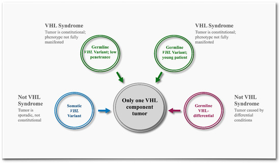 The interpretation of the germline VHL variants and the assessment of their clinical significance in VHL syndrome can be complex. Often, patients suspected of having VHL syndrome present with a single VHL component tumor, such as isolated RCC, hemangioblastoma, pheochromocytoma, or retinal angioma. Non-syndromic component tumors may be common sporadic occurrences that do not involve germline VHL alterations. These sporadic tumors have distinct tumorigenic drivers, often involving somatic alterations in the VHL or other genes. The allelic autosomal recessive disorder familial erythrocytosis type 2 (ECYT2, OMIM # 263400) adds further complexity, as the VHL germline variants related to ECYT2 are generally not associated with VHL syndrome. Alternatively, component tumors may be constitutional, caused by germline alterations in genes other than the VHL. Genes such as FH, FLCN, MET, BAP1, SDHA, SDHB, SDHC, SDHD, SDHAF2, TMEM127, MAX, and RET are associated with cancer susceptibility syndromes that present overlapping tumors commonly seen in VHL syndrome [9]. Finally, a single VHL-component tumor could be attributed to age-related penetrance or the low penetrance of certain VHL alleles in adults (Figure 1). These observations highlight the confounding factors in the clinical interpretation of the VHL variants and underscore the need for an integrated and comprehensive evidence-based assessment of the VHL variants.