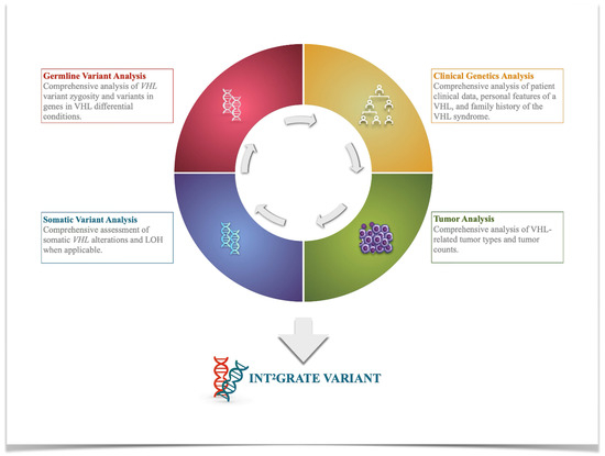 Schematic representation of the INT2GRATE|VHL. The INT2GRATE variant evidence framework (VEF) has the following four main components: (1) germline variants, including the VHL variants and the zygosity status, and variants in genes related to VHL differential conditions; (2) pertinent patient clinical genetics data related to personal and family history of VHL syndrome; (3) tumor-derived data, including VHL-related tumor counts and types; and (4) somatic genetic variants in the VHL gene. A comprehensive evaluation of the INT2GRATE variants can help differentiate their role in non-syndromic sporadic tumors or syndromic VHL, VHL allelic disorders, and differential conditions.