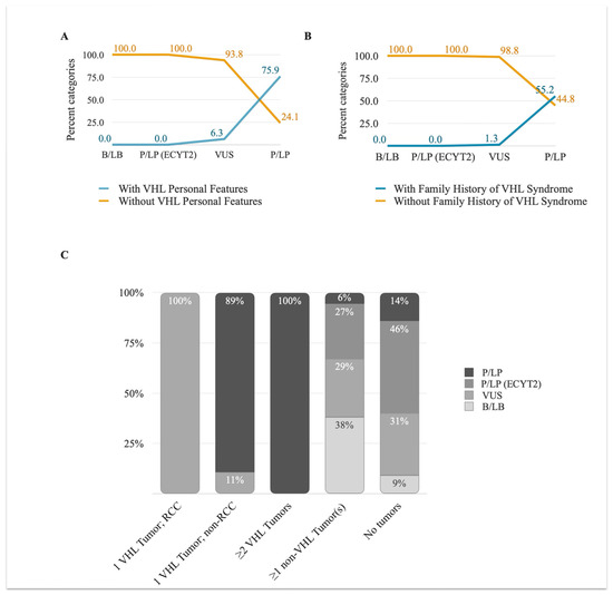 The clinical history and VHL tumors across patient cohorts before the INT2GRATE analysis. The (A,B) panels show the proportion of patients with VHL personal features and/or tumors (A) and family history of VHL syndrome (B). The variant classifications (ACMG) provided by the reporting laboratory are included on the X-axis. Panel (C) shows the distribution of VHL tumors across the variants according to their ACMG classifications. P/LP: pathogenic/likely pathogenic variants; P/LP (ECYT2): pathogenic/likely pathogenic variants related to ECYT2; VUS: variants of uncertain significance; B/LB: benign and likely benign variants.